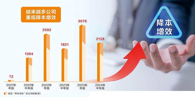 據(jù)證券時(shí)報(bào)·數(shù)據(jù)寶統(tǒng)計(jì),在半年報(bào)或年報(bào)中提及“降本增效”這一關(guān)鍵詞的上市公司數(shù)量呈逐年上升趨勢(shì)。2022年年報(bào)提及的公司接近2600家,此前一年不足百家;2023年年報(bào)提及的公司數(shù)量再創(chuàng)新高,超過3000家。2024年半年報(bào)中,超過2100家公司再度提及降本增效,數(shù)量依然創(chuàng)下歷史同期最高。
