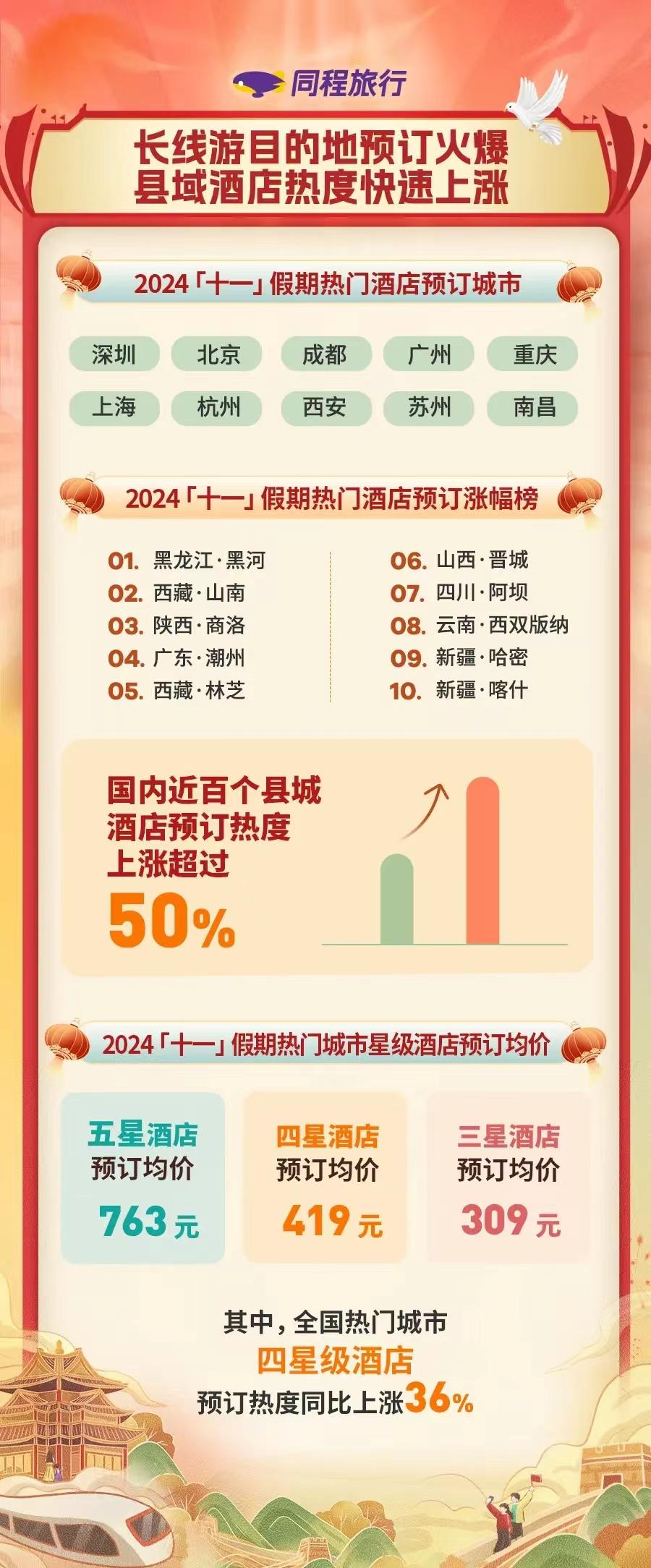 同程旅行數(shù)據(jù)顯示,2024年“十一”假期國(guó)內(nèi)各大熱門縣域目的地酒店預(yù)訂增速超過大盤。其中,預(yù)訂熱度同比漲幅超過50%的縣和縣級(jí)市就有近百個(gè)。
