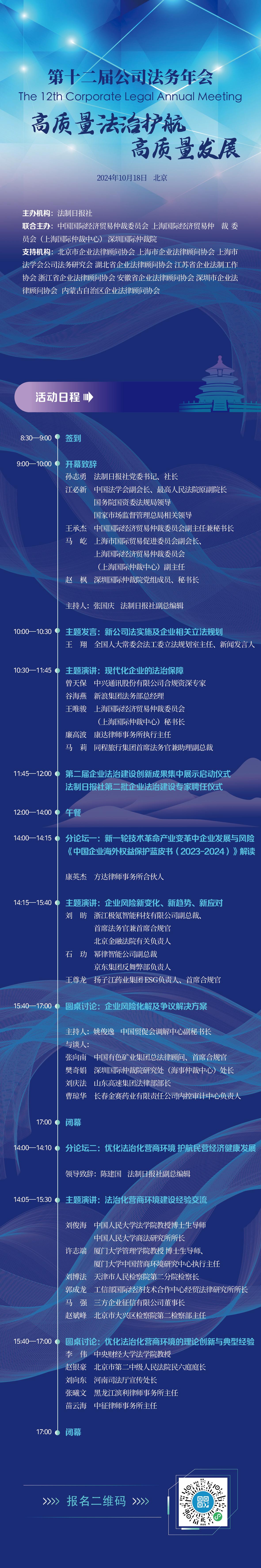 2024年是實現“十四五”規(guī)劃目標任務的關鍵一年。面對新一輪科技革命和產業(yè)變革,企業(yè)在迎來發(fā)展新機遇的同時,也面臨著數據安全治理、知識產權保護、反壟斷、出口管制、經濟制裁等諸多法律風險和挑戰(zhàn)。為此,法制日報社將舉辦“第十二屆公司法務年會(北京)”活動,旨在共同探尋企業(yè)在法治軌道上實現高質量發(fā)展的路徑和策略,推動企業(yè)在以中國式現代化全面推進強國建設、民族復興偉業(yè)中作出更大貢獻。