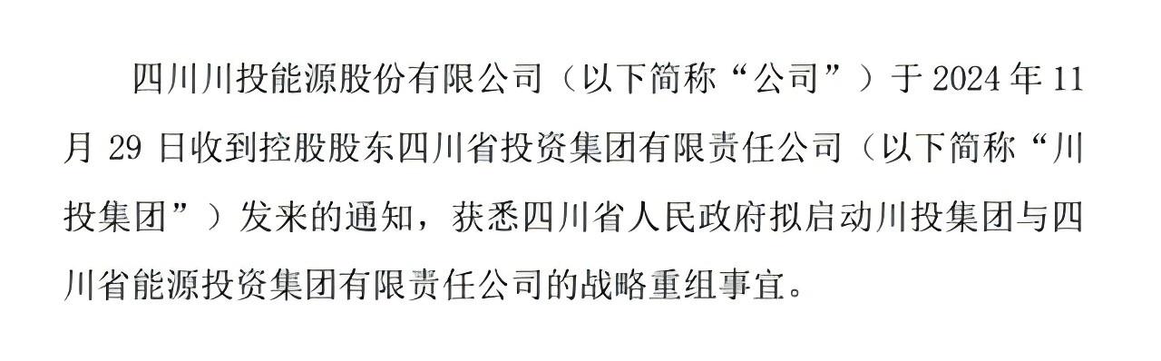 11月29日晚,川投能源、川能動力、華海清科3家A股公司披露,公司接到通知,獲悉四川省人民政府擬啟動四川省投資集團有限責任公司(簡稱“川投集團”)與四川省能源投資集團有限責任公司(簡稱“能投集團”)的戰(zhàn)略重組事宜。上述事宜涉及相關政府部門的批準,尚處于前期籌劃階段,能否獲得批準存在不確定性。
