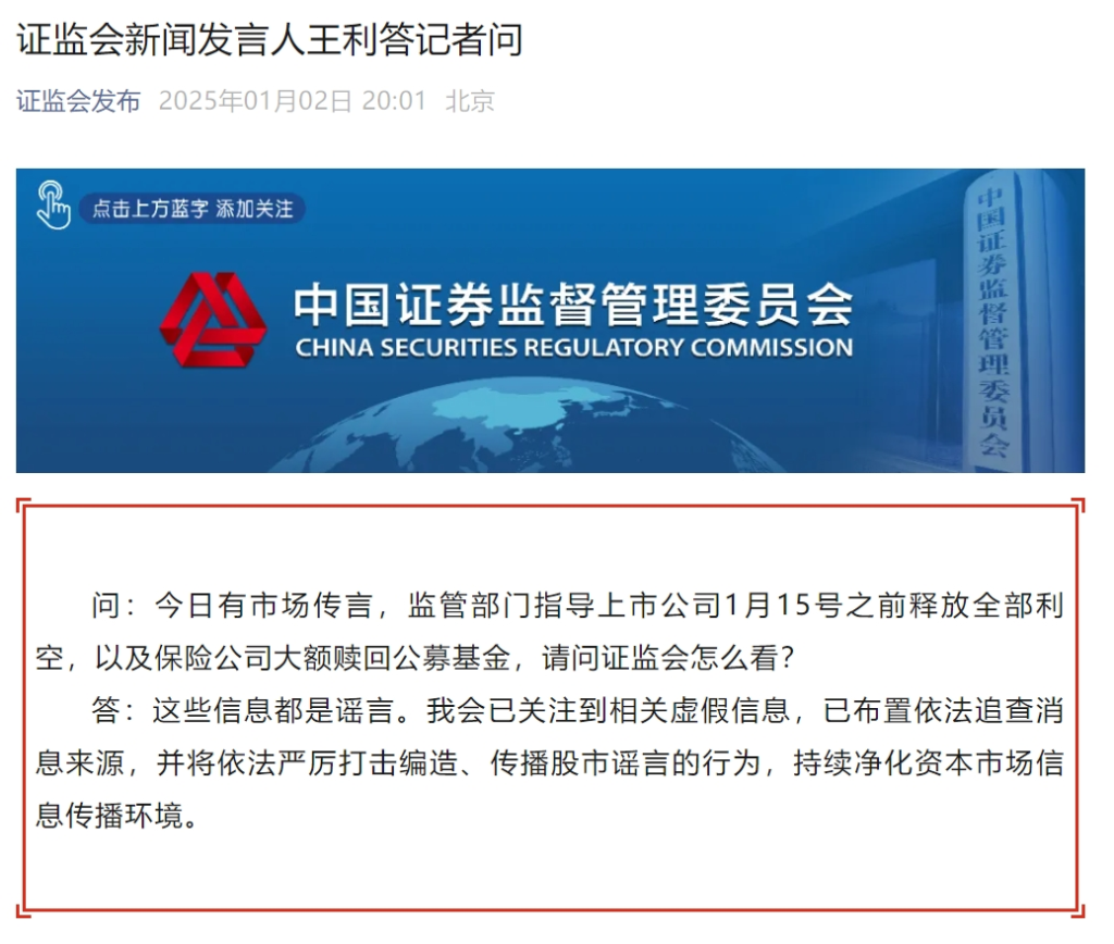證監(jiān)會(huì)新聞發(fā)言人王利1月2日回應(yīng)“監(jiān)管部門指導(dǎo)上市公司1月15號(hào)之前釋放全部利空,以及保險(xiǎn)公司大額贖回公募基金”的市場(chǎng)傳言時(shí)說,這些信息都是謠言。證監(jiān)會(huì)已關(guān)注到相關(guān)虛假信息,已布置依法追查消息來源,并將依法嚴(yán)厲打擊編造、傳播股市謠言的行為,持續(xù)凈化資本市場(chǎng)信息傳播環(huán)境。