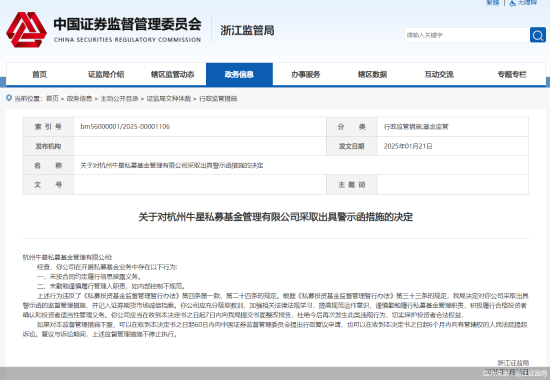 1月21日,浙江證監(jiān)局發(fā)文表示,杭州牛星私募基金管理有限公司(以下簡(jiǎn)稱“牛星私募”)在開(kāi)展私募基金業(yè)務(wù)中存在未按合同約定履行信息披露義務(wù);未勤勉謹(jǐn)慎履行管理人職責(zé),如內(nèi)部控制不規(guī)范。