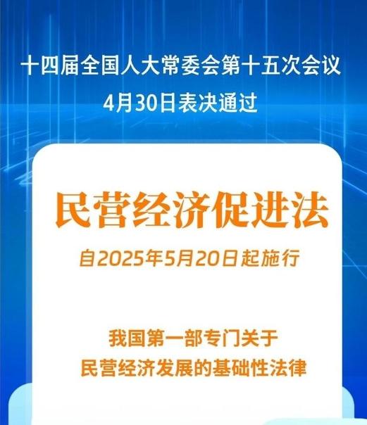 4月30日,十四屆全國(guó)人大常委會(huì)第十五次會(huì)議表決通過(guò)民營(yíng)經(jīng)濟(jì)促進(jìn)法,自2025年5月20日起施行。民營(yíng)經(jīng)濟(jì)促進(jìn)法共9章78條,包括總則、公平競(jìng)爭(zhēng)、投資融資促進(jìn)、科技創(chuàng)新、規(guī)范經(jīng)營(yíng)、服務(wù)保障、權(quán)益保護(hù)、法律責(zé)任和附則。