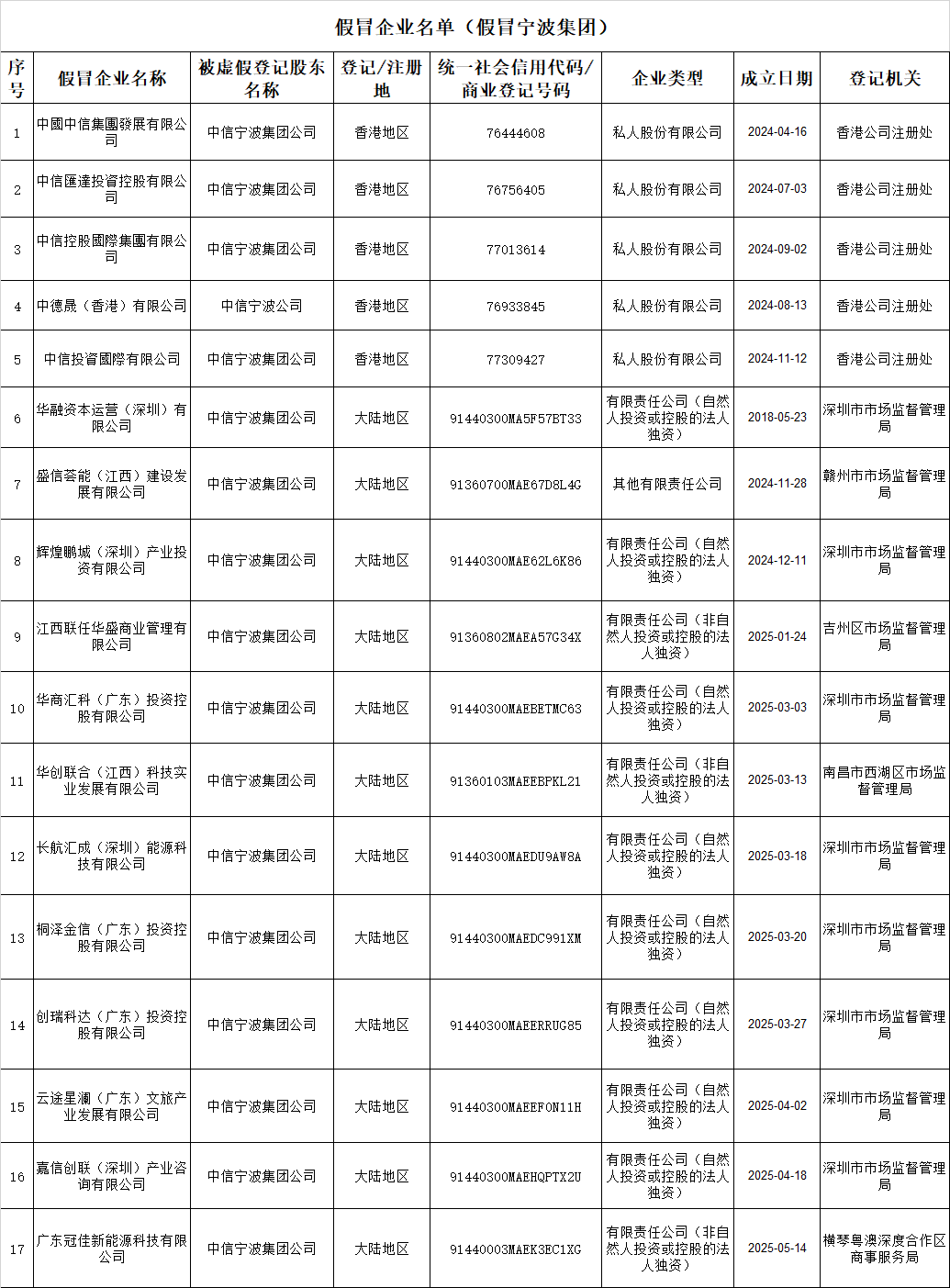 日前,中信集團(tuán)監(jiān)測(cè)到香港中國中信集團(tuán)發(fā)展有限公司、中信控股國際集團(tuán)有限公司、華融資本運(yùn)營(深圳)有限公司、華商匯科(廣東)投資控股有限公司等公司通過偽造公章、簽字等方式向香港公司注冊(cè)處、大陸市場(chǎng)監(jiān)管部門提交虛假文件,將中信集團(tuán)下屬中信寧波集團(tuán)公司、中信寧波公司虛假登記為其股東。為保護(hù)公眾及投資者權(quán)益,維護(hù)公司聲譽(yù),中信集團(tuán)聲明如下:
