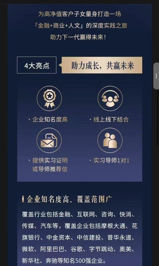 日前,興業(yè)銀行私人銀行推出一項“2025菁英實習(xí)計劃”,可以為高凈值客戶的子女提供知名企業(yè)實習(xí)機會,覆蓋行業(yè)涉及金融、互聯(lián)網(wǎng)、咨詢快消等行業(yè)。