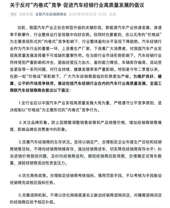 6月3日,全國工商聯(lián)汽車經(jīng)銷商商會發(fā)布《關于反對“內(nèi)卷式”競爭 促進汽車經(jīng)銷行業(yè)高質量發(fā)展的倡議》。