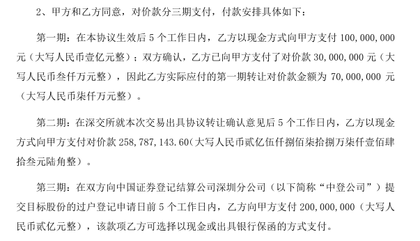 對價(jià)款分三期支付。第一期在本協(xié)議生效后5個工作日內(nèi),福州千景以現(xiàn)金方式向天凱匯達(dá)支付1億元;雙方確認(rèn),福州千景已向天凱匯達(dá)支付了對價(jià)款3000萬元,因此福州千景實(shí)際應(yīng)付的第一期轉(zhuǎn)讓對價(jià)款金額為7000萬元。第二期在深交所就本次交易出具協(xié)議轉(zhuǎn)讓確認(rèn)意見后5個工作日內(nèi),福州千景以現(xiàn)金方式向天凱匯達(dá)支付對價(jià)款2.59億元。第三期在雙方向中國證券登記結(jié)算公司深圳分公司提交目標(biāo)股份的過戶登記申請日前5個工作日內(nèi),福州千景向天凱匯達(dá)支付2億元,可選擇以現(xiàn)金或出具銀行保函的方式支付。
