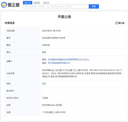 愛(ài)企查App顯示,近日,杭州娃哈哈宏盛食品飲料營(yíng)銷有限公司與浙江娃哈哈服飾有限公司相關(guān)合同糾紛案件新增開(kāi)庭公告,原告為杭州娃哈哈宏盛食品飲料營(yíng)銷有限公司,該案件將于8月1日在杭州市蕭山區(qū)人民法院開(kāi)庭審理。