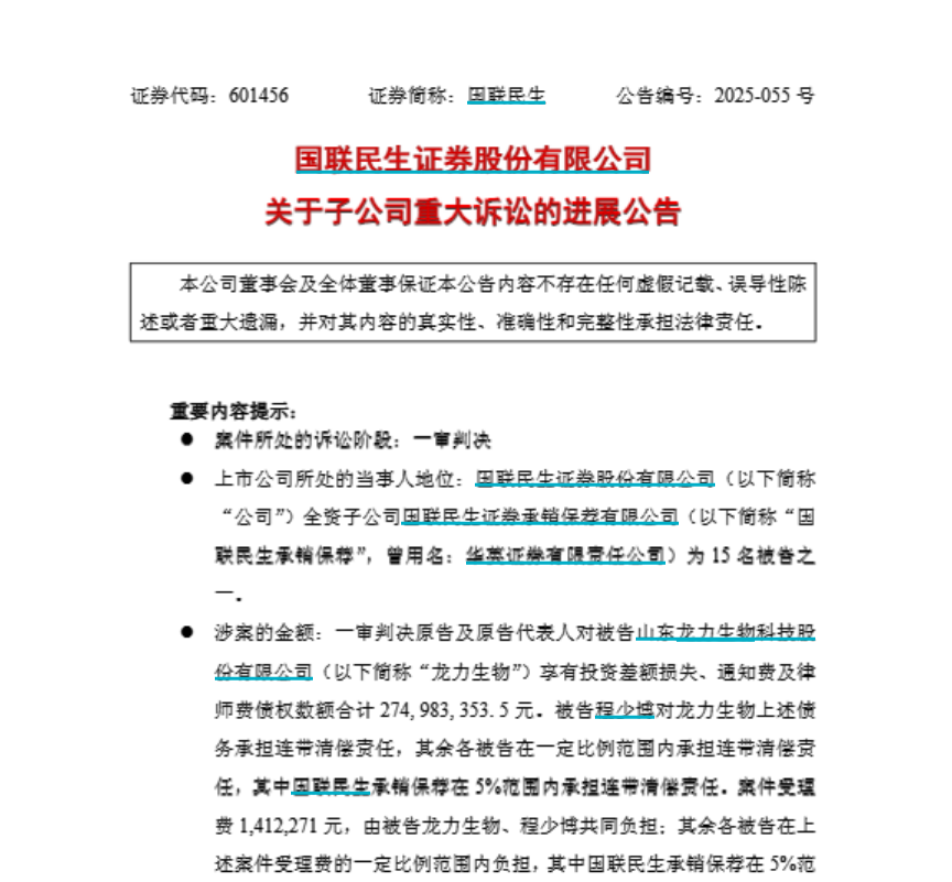 中介機構(gòu)方面,國聯(lián)民生證券承銷保薦有限公司(簡稱“國聯(lián)民生承銷保薦”)在原告各項損失5%的范圍內(nèi)承擔連帶賠償責任,立信會計師事務(wù)所(以下簡稱“立信所”)在原告各項損失30%的范圍內(nèi)承擔連帶賠償責任。8月26日晚間,國聯(lián)民生發(fā)布關(guān)于子公司重大訴訟的進展公告,公告了該事項。
