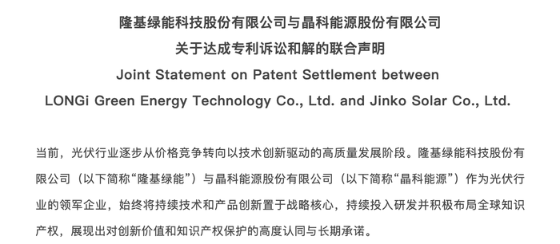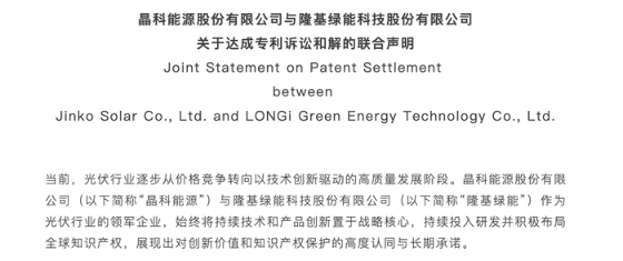 聲明以中英雙語(yǔ)呈現(xiàn),稱隆基綠能與晶科能源聯(lián)合宣布,就雙方及雙方關(guān)聯(lián)公司在全球范圍內(nèi)正在進(jìn)行的相關(guān)專利主張和法律事項(xiàng),達(dá)成和解協(xié)議。