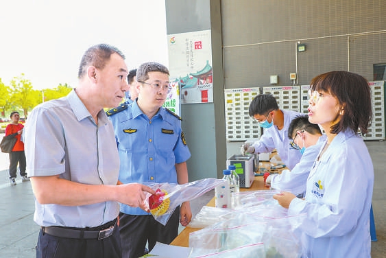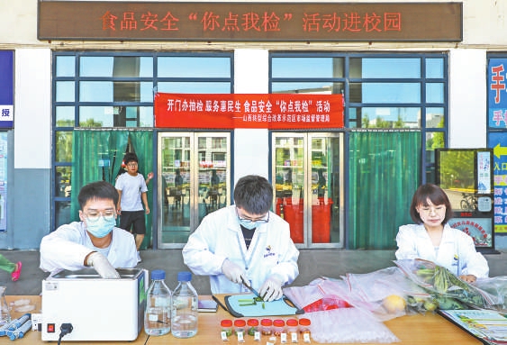 “您好,我們可以自己選擇檢測(cè)食品嗎?”6月21日,在太原學(xué)院餐廳門(mén)前,很多大學(xué)生圍在山西綜改區(qū)市場(chǎng)監(jiān)管局設(shè)立的“你點(diǎn)我檢”桌前向工作人員提問(wèn)。該局食品監(jiān)管科副科長(zhǎng)吳煒耐心給學(xué)生們講解:“沒(méi)問(wèn)題,咱們掃碼后可以根據(jù)需求選擇,我們會(huì)根據(jù)大家的選擇進(jìn)行相關(guān)檢測(cè)。”幾位學(xué)生在吳煒的引導(dǎo)下進(jìn)行了操作,同時(shí)觀看了食品安全快檢流程?!拔覀兊牟妥谰涂磕銈儽O(jiān)督,必須給你們點(diǎn)贊!”幾位同學(xué)對(duì)市場(chǎng)監(jiān)管部門(mén)的工作表示贊揚(yáng)。