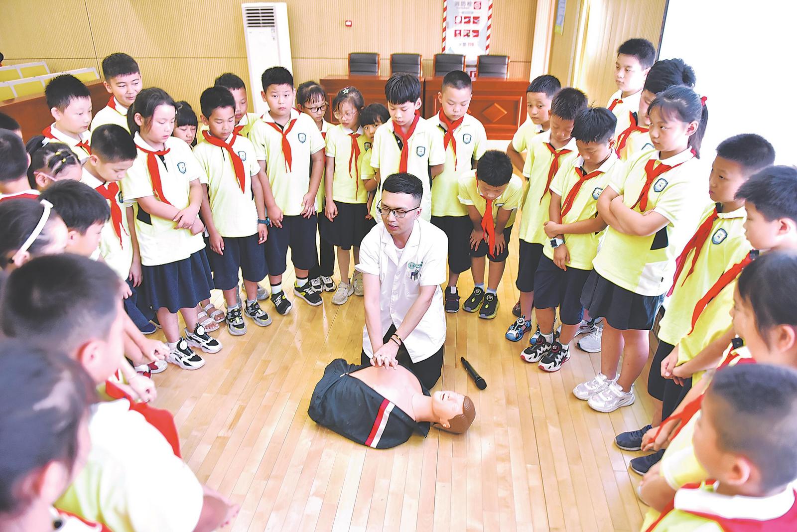 9月9日是2023年“世界急救日”。9月6日,合肥市振興小學(xué)開展“應(yīng)急救護(hù)進(jìn)校園”活動,邀請合肥市蜀山區(qū)健康巡講專家現(xiàn)場向師生傳授應(yīng)急救護(hù)技能和自動體外除顫器的使用技巧等,普及急救知識。 通訊員 葛宜年 攝