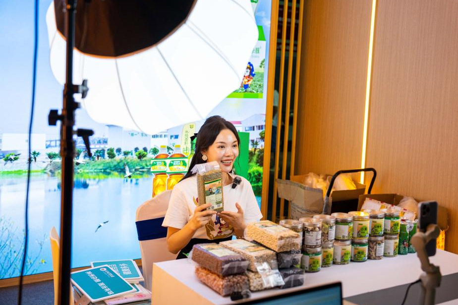 9月15日,在長(zhǎng)沙國(guó)際會(huì)展中心,參展商通過(guò)直播推銷(xiāo)雜糧。