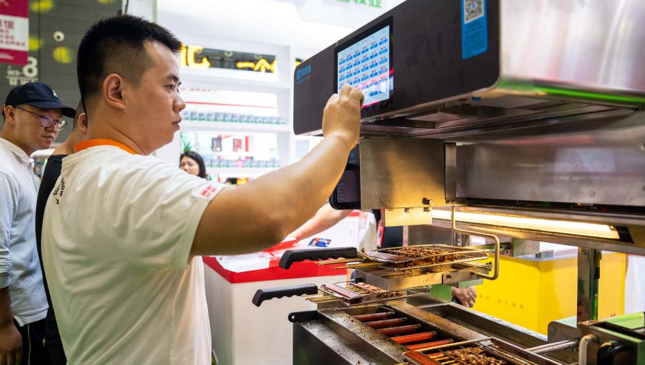 9月15日,在長(zhǎng)沙國(guó)際會(huì)展中心,參展商在展示自動(dòng)燒烤機(jī)操作方法。