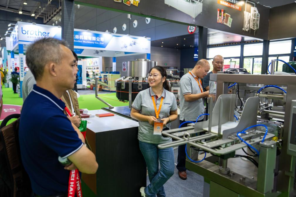 9月15日,在長(zhǎng)沙國(guó)際會(huì)展中心,參展商(中)向觀(guān)眾介紹食品包裝設(shè)備。