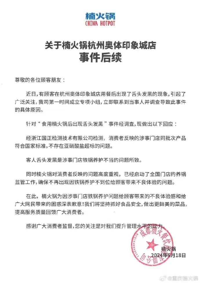 6月19日,“楠火鍋”公布了檢測(cè)結(jié)果,表示:“經(jīng)浙江國(guó)正檢測(cè)技術(shù)有限公司檢測(cè),消費(fèi)者反映的涉事門(mén)店同批次產(chǎn)品符合國(guó)家標(biāo)準(zhǔn),不存在亞硝酸鹽超標(biāo)的問(wèn)題??腿松囝^發(fā)黑是因涉事門(mén)店鐵鍋養(yǎng)護(hù)不當(dāng)所致。“楠火鍋”對(duì)消費(fèi)者反映的情況高度重視,已啟動(dòng)全國(guó)門(mén)店的養(yǎng)鍋監(jiān)管工作,確保不再出現(xiàn)因鐵鍋養(yǎng)護(hù)不到位給顧客帶來(lái)不良體驗(yàn)的問(wèn)題?!?/p>