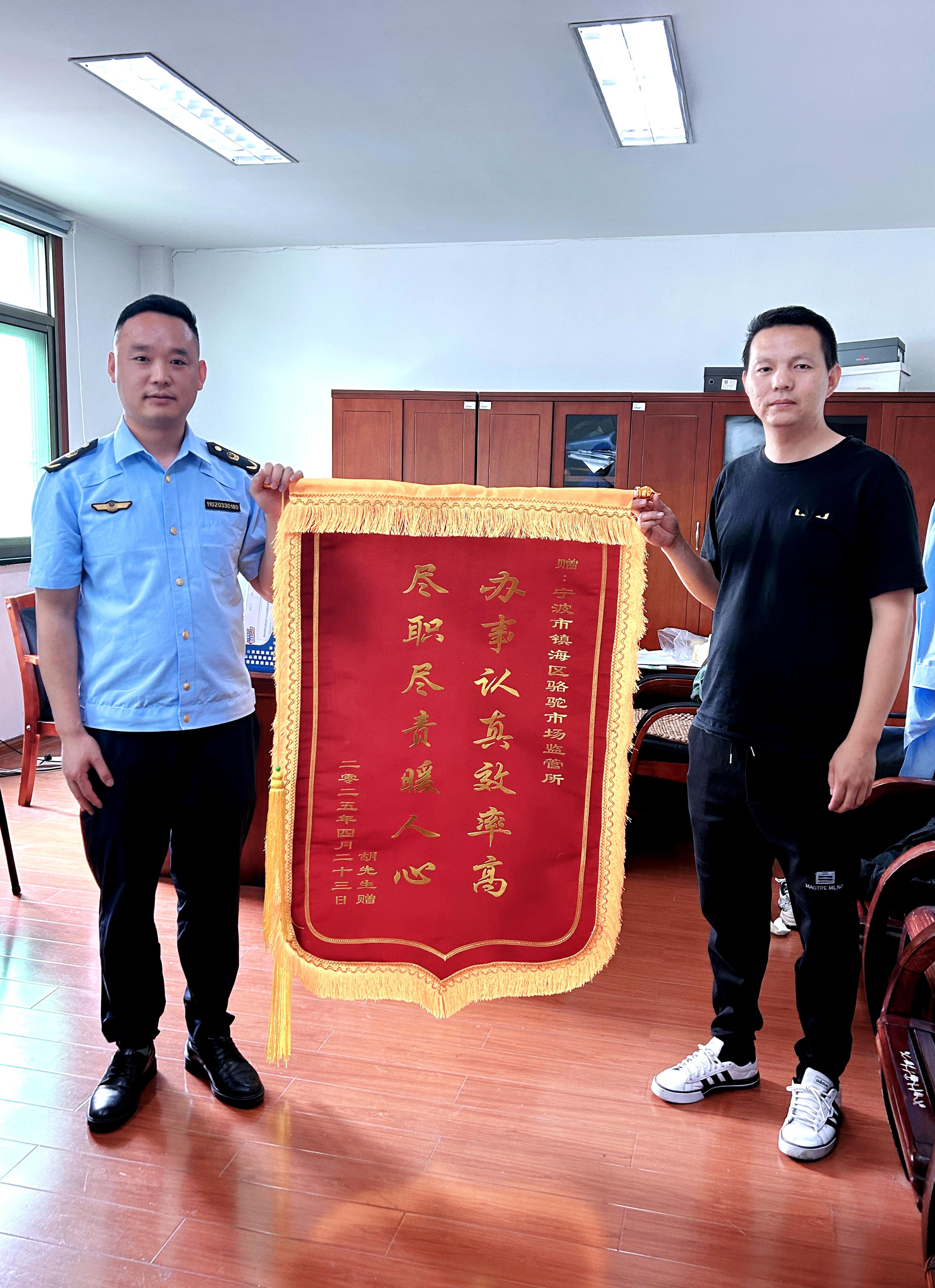 執(zhí)法不是冷冰冰的罰單,而是有溫度的服務(wù)。5月6日,老胡捧著“辦事認(rèn)真效率高 盡職盡責(zé)暖人心”的錦旗來到駱駝市場(chǎng)監(jiān)管所,和執(zhí)法人員一起拍下了一張有溫度的照片。