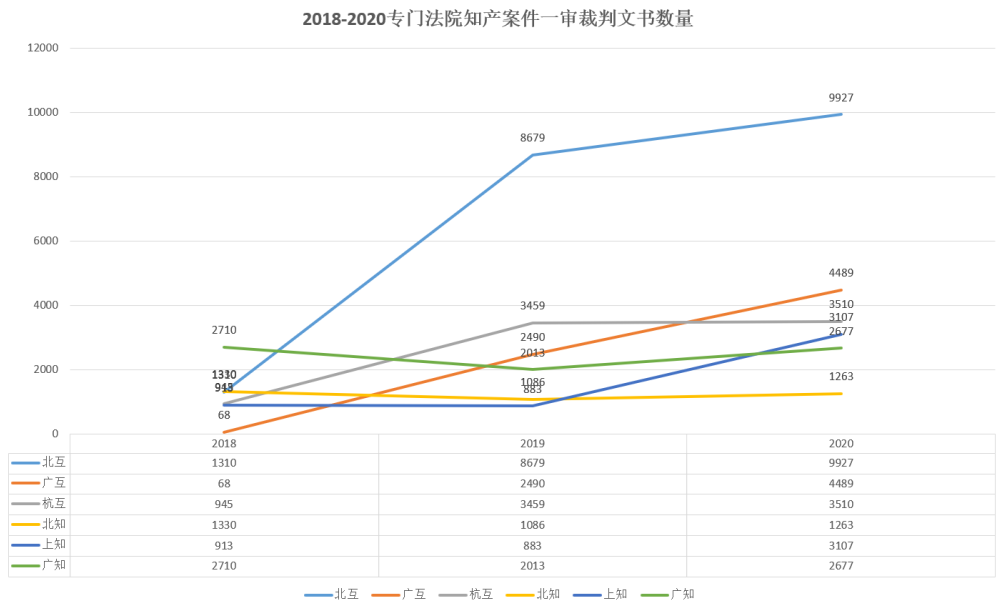 從整體趨勢上看,6個(gè)專門法院中除廣知外均呈現(xiàn)上升趨勢;三大互聯(lián)法院裁判文書的總數(shù)量整體高于三大知識(shí)產(chǎn)權(quán)法院。其中,北互、廣互從2018-2020年數(shù)據(jù)呈現(xiàn)一個(gè)快速攀升的趨勢,北互的裁判文書數(shù)量從1310上升到9927,廣互的裁判文書數(shù)量從68上升到4489。