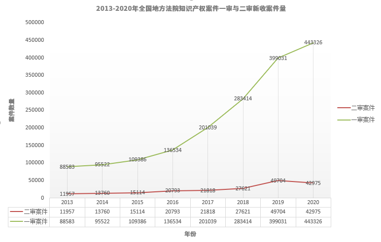 根據(jù)最高人民法院各年度知識(shí)產(chǎn)權(quán)司法保護(hù)白皮書(2013-2020年)的公開數(shù)據(jù),本報(bào)告總結(jié)了這八年的總體收案情況(表一)??傮w而言,全國地方法院知識(shí)產(chǎn)權(quán)案件一審與二審新收案件量均呈現(xiàn)逐年遞增趨勢,其中一審新收案件量從2013年的88583件,增長至2020年的443326件,增長約4倍;二審新收案件量從2013年的11957件,增長至2020年的42975件,增長約2.6倍。此外,一審案件數(shù)量增幅明顯大于二審案件數(shù)量,一定程度上反映了我國一審案件審判質(zhì)效逐步提高,多數(shù)知識(shí)產(chǎn)權(quán)案件在一審階段得到解決。