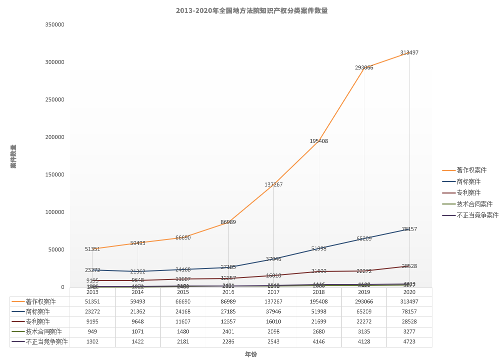 根據(jù)最高人民法院各年度知識(shí)產(chǎn)權(quán)司法保護(hù)白皮書(2013-2020年)公布的著作權(quán)案件、商標(biāo)案件、專利案件、技術(shù)合同案件、不正當(dāng)競爭案件統(tǒng)計(jì)數(shù)據(jù),可以發(fā)現(xiàn)知識(shí)產(chǎn)權(quán)各類型案的變化趨勢(表二),即各類案件均呈現(xiàn)逐年遞增趨勢,其中著作權(quán)增幅最大、不正當(dāng)競爭案件次之,這一現(xiàn)象與2013-2020年互聯(lián)網(wǎng)內(nèi)容產(chǎn)業(yè)與數(shù)字經(jīng)濟(jì)的發(fā)展趨勢相吻合,以互聯(lián)網(wǎng)企業(yè)為訴訟主體的案件集中于著作權(quán)案件與不正當(dāng)競爭案件,推動(dòng)相關(guān)案件數(shù)量大幅增加,也反映出司法保護(hù)成為互聯(lián)網(wǎng)企業(yè)維護(hù)自身權(quán)益的重要手段。此外,2013年著作權(quán)案件占知識(shí)產(chǎn)權(quán)案件整體的比例59.66%,2020年的比例為73.21%,可以說著作權(quán)案件已成為知識(shí)產(chǎn)權(quán)訴訟的重點(diǎn)案件類型。