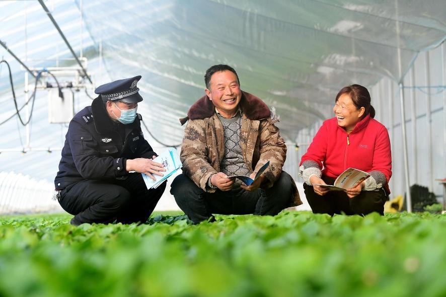 1月29日,安徽省阜南縣公安局會龍鎮(zhèn)派出所民警在轄區(qū)豐振生態(tài)農業(yè)科技園溫室大棚里,向種植戶宣講防范網絡電信詐騙知識。
