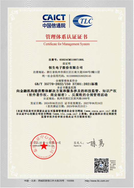 恒生電子股份有限公司的主要業(yè)務(wù)是向金融機構(gòu)提供整體解決方案和服務(wù),此次認證范圍覆蓋了主要業(yè)務(wù)涉及的科技監(jiān)管、軟件著作權(quán)、商業(yè)秘密、反腐敗的合規(guī)管理活動。ISO 37301是國際通用的合規(guī)管理體系認證標準,規(guī)定了組織建立、運行、保持和改進合規(guī)管理體系的要求,獲得該認證,表明恒生公司具備了該標準所要求的合規(guī)管理水平及能力。