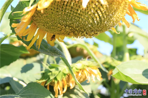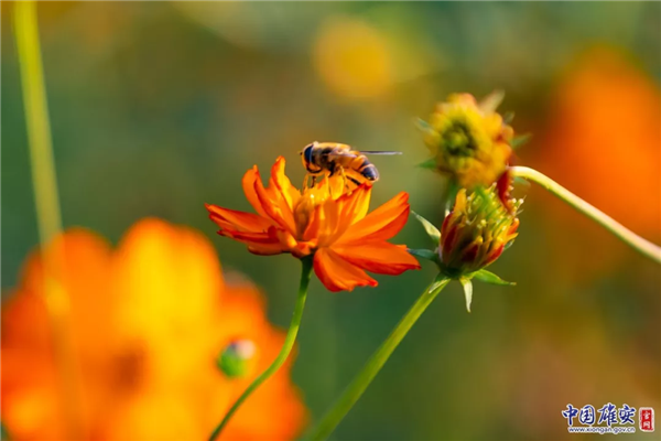 落在硫華菊上的蜜蜂正“辛勤工作”。中國雄安官網(wǎng)記者毛鶴然 攝