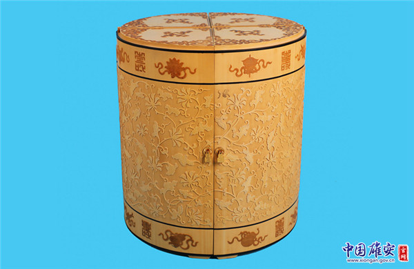王樂修介紹,竹簧的制作是一種非常復(fù)雜的工藝,往往需要十幾道工序。竹簧的材料是用毛竹、楠竹,去其外皮,刮去竹肉,留下毫米左右的竹內(nèi)層叫竹簧,將其竹簧片曬干后粘貼在各種形狀的木胎上,雕刻出花紋圖案。竹簧工藝打破了竹子原材料的局限性,可方、可圓、可扁,器物完美。作品突出了傳統(tǒng)宮廷吉祥紋飾,融入了傳統(tǒng)文化韻味,雕刻精細(xì),栩栩如生。