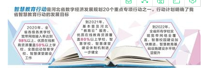 智慧教育行動(dòng)是河北省數(shù)字經(jīng)濟(jì)發(fā)展規(guī)劃20個(gè)重點(diǎn)專項(xiàng)行動(dòng)之一。行動(dòng)計(jì)劃明確了我省智慧教育行動(dòng)的發(fā)展目標(biāo):2020年,全省各級(jí)各類學(xué)校寬帶網(wǎng)絡(luò)接入率達(dá)到98%以上,優(yōu)質(zhì)在線教育資源覆蓋50%以上學(xué)校,全面啟動(dòng)智慧學(xué)校、智慧課堂建設(shè)工作。到2021年,基本普及河北“教育云”服務(wù),優(yōu)質(zhì)在線教育資源覆蓋80%以上學(xué)校,智慧學(xué)校、智慧課堂建設(shè)體制機(jī)制進(jìn)一步健全。到2022年,全省所有學(xué)校實(shí)現(xiàn)寬帶網(wǎng)絡(luò)全覆蓋,智慧校園建設(shè)加快推進(jìn),智慧教育基礎(chǔ)設(shè)施建設(shè)水平明顯提升。河北“教育云”服務(wù)全面普及,優(yōu)質(zhì)教育教學(xué)資源的集成推送更加高效,教育管理信息的整合應(yīng)用更加普及。師生信息化應(yīng)用水平與信息素養(yǎng)普遍提升,以自主、個(gè)性、協(xié)作、泛在為特征的新型教學(xué)模式廣泛應(yīng)用。現(xiàn)代信息技術(shù)與教育實(shí)現(xiàn)深度融合,網(wǎng)絡(luò)化、數(shù)字化、智能化、個(gè)性化、終身化的教育體系初步形成,智慧教育總體水平躋身中西部前列,教育現(xiàn)代化和教育強(qiáng)省建設(shè)取得重要進(jìn)展。