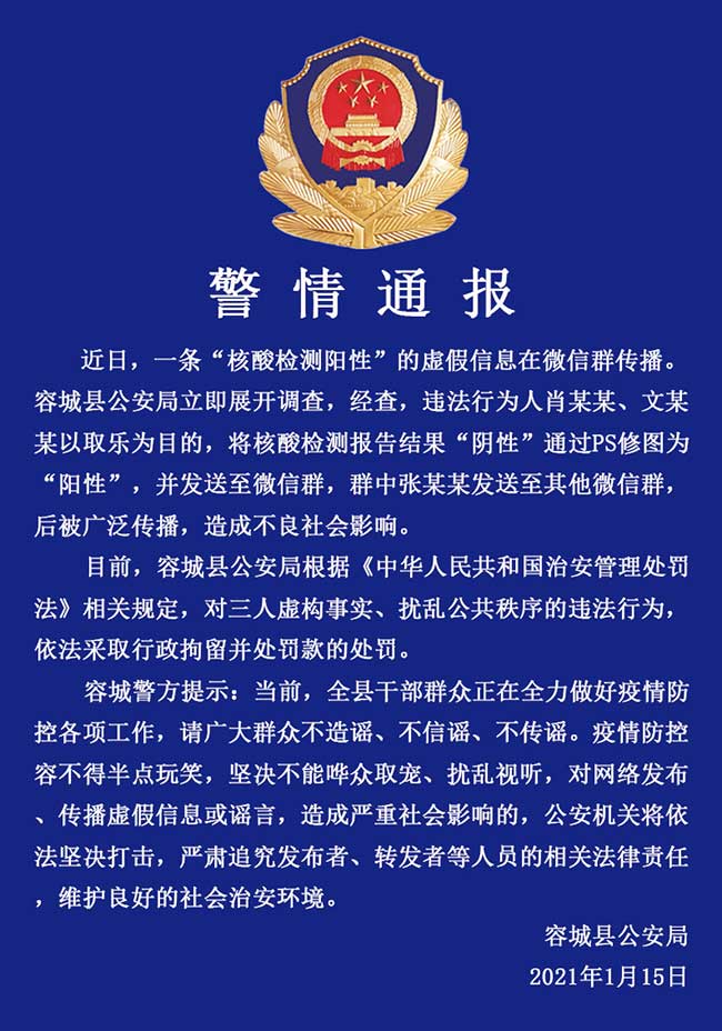人民網雄安1月15日 (王紅 何美萱)據雄安新區(qū)容城縣公安局消息,容城縣3人因傳播“核酸檢測陽性”虛假信息被行政拘留并處罰款。