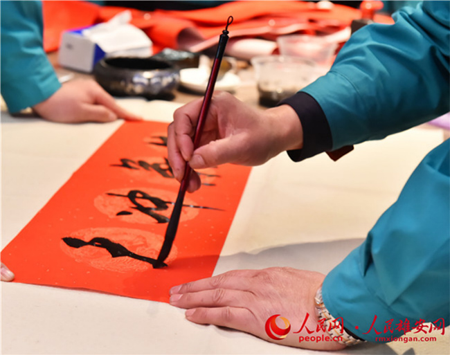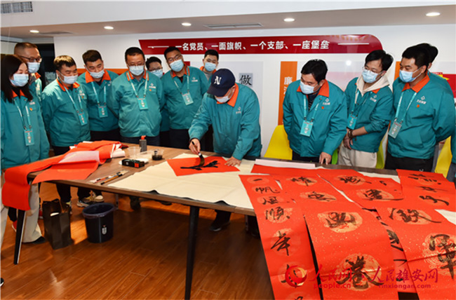 雄安新區(qū)容東片區(qū)B1組團(tuán)安置房項(xiàng)目留在雄安過(guò)年建設(shè)者寫(xiě)春聯(lián)。