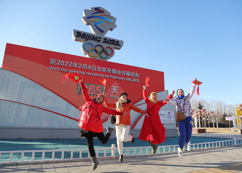 2月4日,張家口市民在市民廣場的冬奧會倒計(jì)時裝置前合影留念。 馬佳琦、徐建平攝