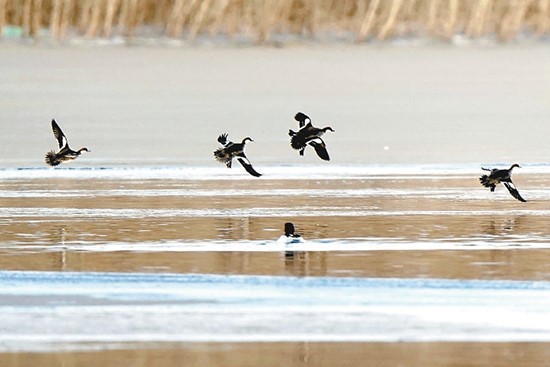 在園博園園博湖附近,鳥兒迎著日出展翅飛翔。隨著永定河生態(tài)環(huán)境越來越好,已有十幾種野生鳥類活躍在周邊。 北京日報(bào)記者 劉平攝