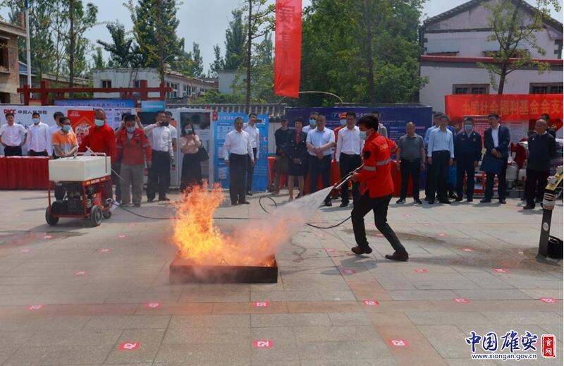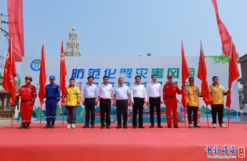 在全國防災(zāi)減災(zāi)日宣傳活動現(xiàn)場,戴泊生向安新小學(xué)頒發(fā)省級地震科普教育示范學(xué)校牌匾,劉樹軍向東淀頭村頒發(fā)全國綜合減災(zāi)示范社區(qū)牌匾,兩位領(lǐng)導(dǎo)共同向雄州救援隊(duì)、雄風(fēng)救援隊(duì)、藍(lán)天救援隊(duì)、美團(tuán)代表隊(duì)等新區(qū)安全宣傳志愿者隊(duì)伍代表授旗。中國人民財(cái)產(chǎn)保險(xiǎn)股份有限公司雄安分公司籌建負(fù)責(zé)人張友林為活動致開幕詞,中國福利基金會支持雄安公益基金執(zhí)行主任、北京支持雄安產(chǎn)業(yè)發(fā)展促進(jìn)會常務(wù)副會長兼秘書長彌雪向雄安新區(qū)捐贈了高空細(xì)水霧滅火消防車。