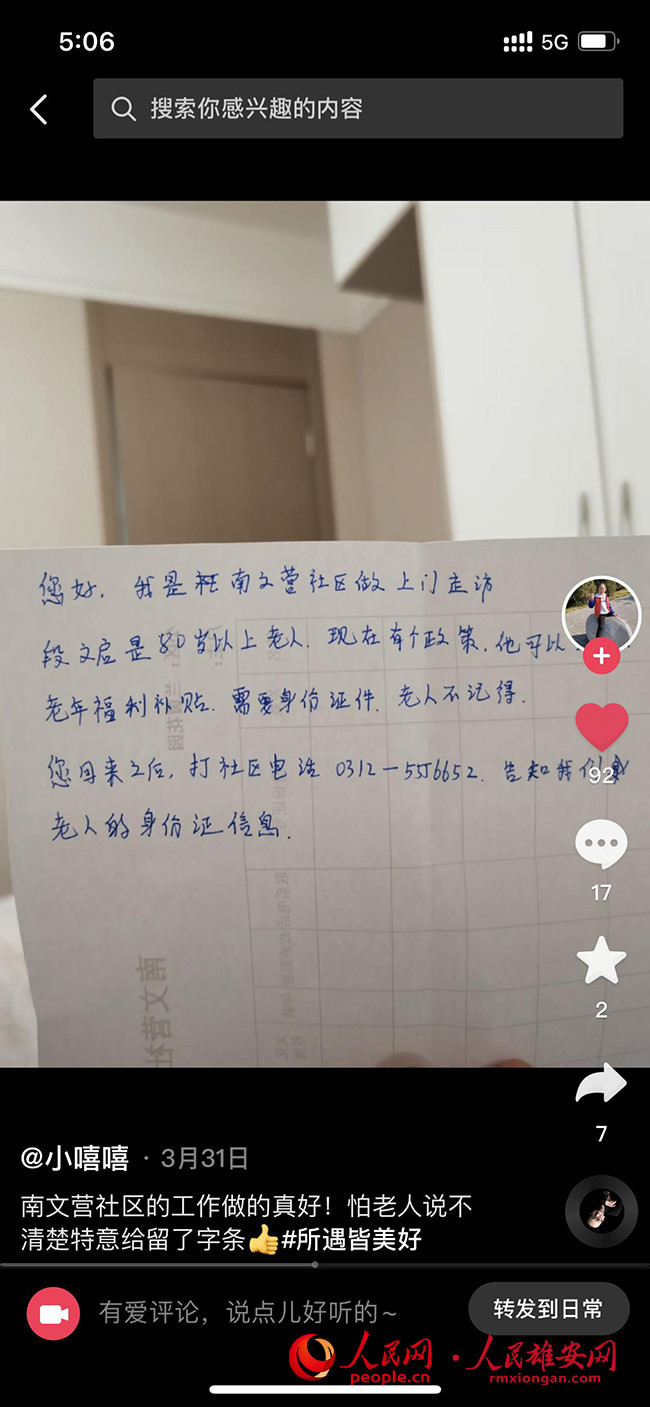 “我給您寫個(gè)紙條,晚上給您兒子看!”容東片區(qū)南文營(yíng)社區(qū)工作者劉思在蘭茵花園走訪時(shí),了解到82歲的段文啟老人符合享受“老年福利補(bǔ)貼”的條件,便立即和他回家取身份證登記??啥挝膯⒃诩依锓野胩觳畔肫饋?,身份證可能被兒子兒媳收起來了。略一思索,劉思決定給老人家屬留個(gè)紙條,并囑托老人給回家的兒子看。