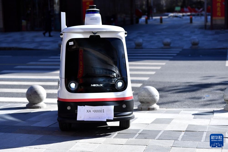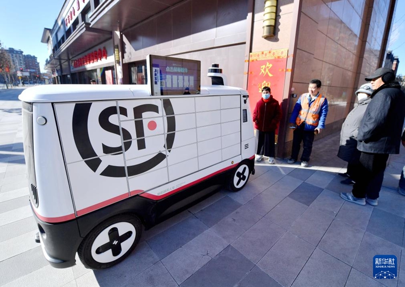1月22日,無人駕駛配送車在派送郵件。新華社記者王曉 攝