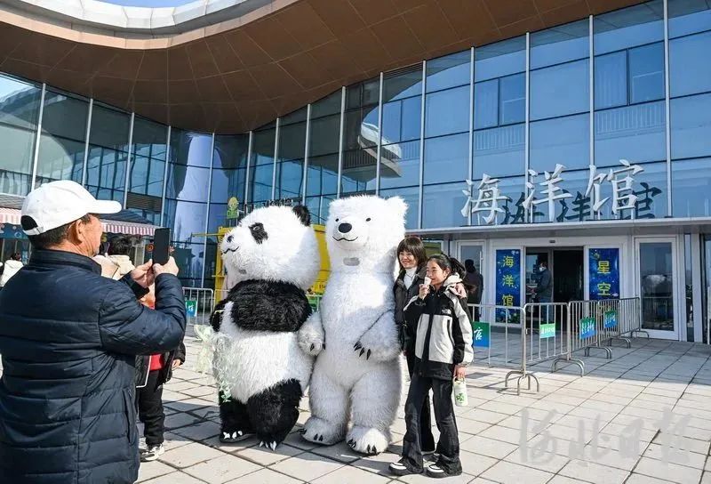 2月12日,游客們?cè)谛郯残聟^(qū)郊野公園海洋館前拍照留念。