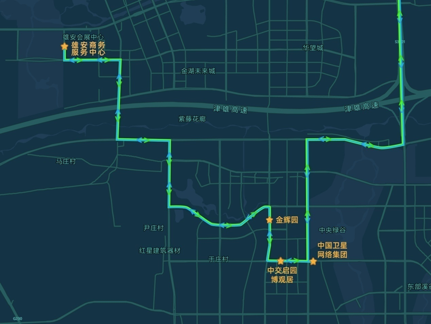 雄安新區(qū)設(shè)置4個上下客站點,從雄安商服中心站始發(fā),途經(jīng)博觀居站、金輝園站、中國星網(wǎng)站。