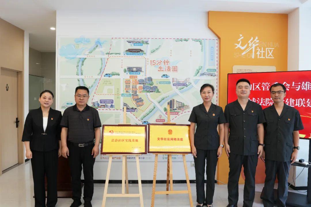 為促推基層治理法治化水平“上臺階”,8月19日,河北雄安新區(qū)中級人民法院、容城縣人民法院與雄安新區(qū)啟動區(qū)管理委員會在文華社區(qū)開展黨建聯(lián)建活動。雄安新區(qū)社會工作部副部長張春雷,雄安中院黨組副書記、副院長李靜靜共同為“法治社區(qū)實(shí)踐基地”和“文華社區(qū)網(wǎng)格法庭”揭牌。啟動區(qū)管委會黨組成員、副主任黃媛媛,容城法院黨組成員、副院長郭凱以及黨員干警、社區(qū)群眾代表30余人參加活動。
