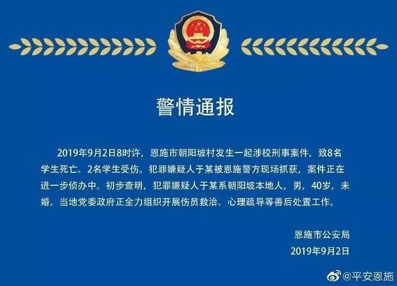 9月2日11時,湖北省恩施市政府官網(wǎng)發(fā)布通報稱,當(dāng)日8時許,恩施市白楊坪鎮(zhèn)朝陽坡小學(xué)發(fā)生一起傷人事件,有10名學(xué)生受傷。該消息經(jīng)主流媒體轉(zhuǎn)載后震驚輿論場,網(wǎng)民驚呼“血色開學(xué)日”。當(dāng)日晚22時,“@平安恩施”發(fā)布通報稱,目前有8名學(xué)生死亡、2名學(xué)生受傷,犯罪嫌疑人于某系本地人,40歲,未婚。通報發(fā)出不久被刪除,引發(fā)網(wǎng)民追問,官方信息管控措施遭到輿論批評。隨后,《南方周末》等媒體介入報道,有關(guān)嫌疑人犯罪前科、服刑減刑經(jīng)歷等細(xì)節(jié)被曝光,關(guān)于其作案動機(jī)的猜測充斥網(wǎng)絡(luò)。該案發(fā)生后,國家衛(wèi)健委派出應(yīng)急專家組,開展受傷學(xué)生醫(yī)療救治等工作,公安部、教育部部署加強(qiáng)中小學(xué)、幼兒園安全工作。目前,案件暫未有最新進(jìn)展公布。