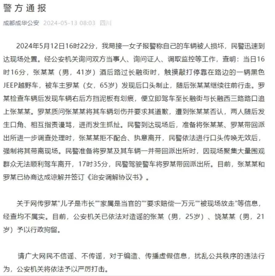 5月13日8時許,成都市成華區(qū)警方發(fā)布通報介紹事發(fā)過程,稱5月12日16時許,張某某(男,41歲)酒后觸摸敲打??吭诼愤叺牧_某(女,65歲)的車,雙方發(fā)生口角抓扯。張某某拒不配合、執(zhí)意離開,民警依法進行口頭傳喚無效后,強制將其帶離現(xiàn)場。民警準備將羅某及其車輛一并帶回派出所時,因現(xiàn)場聚集大量圍觀群眾無法順利駕車離開。目前,雙方已協(xié)商達成諒解并簽訂調(diào)解書,網(wǎng)傳羅某“要求賠償一萬元”“被現(xiàn)場放走”等信息均不屬實,公安機關(guān)已依法對造謠的張某和饒某某予以行政拘留。該通報被光明網(wǎng)、“@四川日報”等媒體轉(zhuǎn)發(fā)后帶動輿情升溫,“#警方通報男子摸車被索賠1萬#”等熱搜話題閱讀量累積近8000萬次。部分網(wǎng)民調(diào)侃車主“神通廣大”,吐槽“以后停在路邊的車別亂摸”;有網(wǎng)民對通報內(nèi)容表示懷疑,追問為何“把吉普車圍起來”等,還有網(wǎng)民呼吁公開現(xiàn)場監(jiān)控?!癅作家劉小?!薄癅無心簡影”等大V則力挺成都警方,反問“成都市長快60的人了,怎么可能有個65歲的媽”“難道不是因為現(xiàn)場有人煽動造成人員聚集,怕現(xiàn)場失控才來了這么多警察嗎”。