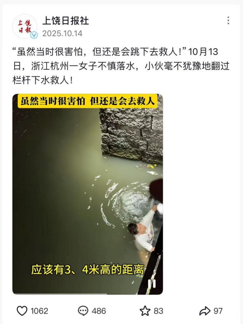 10月14日,“上饒日?qǐng)?bào)社”抖音賬號(hào)報(bào)道稱,10月13日,浙江杭州一女子不慎落水,小伙毫不猶豫地翻過(guò)欄桿下水救人,并配發(fā)救人視頻。該視頻引起部分網(wǎng)民關(guān)注,多數(shù)網(wǎng)民為男子救人行徑點(diǎn)贊。