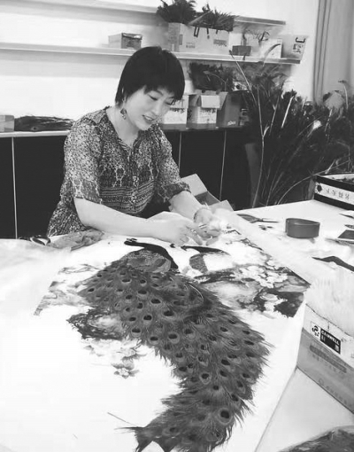 安徽省阜陽市“巾幗新農(nóng)人”、安徽藍(lán)翎生態(tài)農(nóng)業(yè)科技有限公司董事長關(guān)麗在制作孔雀羽毛壁畫。
