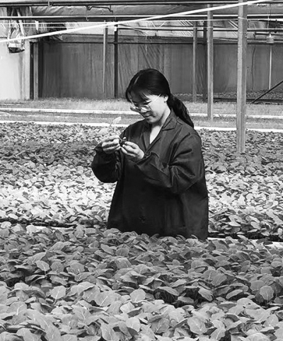 河北省滄州市“巾幗新農(nóng)人”、肅寧縣綠苑蔬菜專業(yè)合作社經(jīng)理張莎莎查看蔬菜秧苗生長情況。