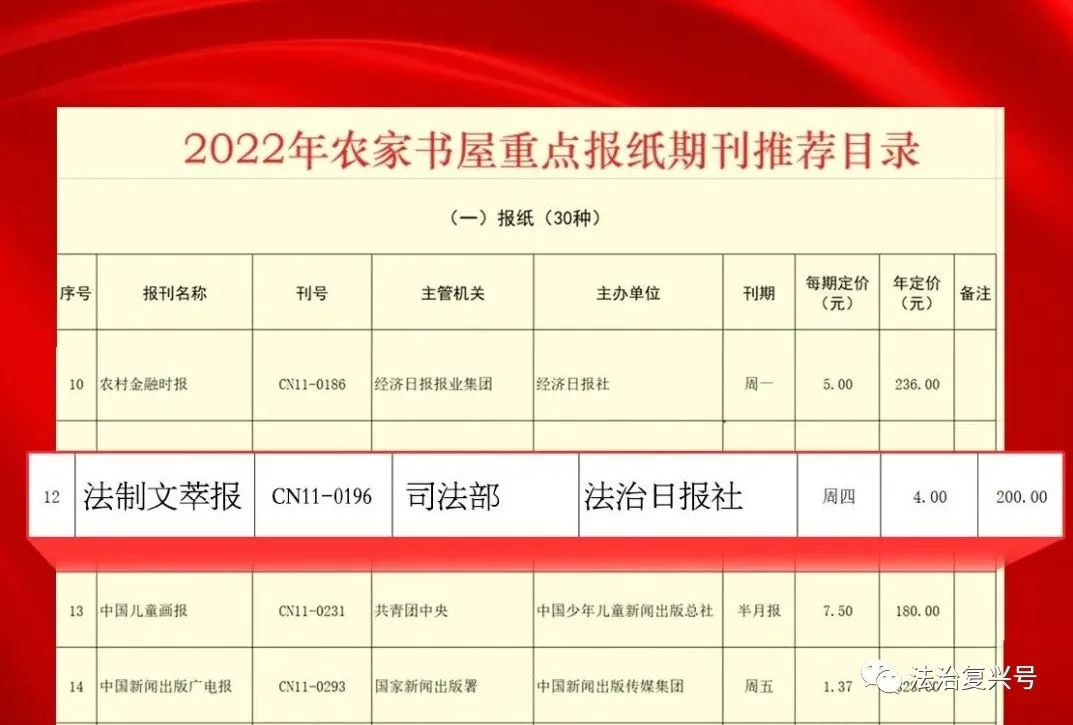 近日,經(jīng)中央宣傳部組織專家評(píng)審,《法制文萃報(bào)》成功入選《2022年農(nóng)家書屋重點(diǎn)出版物推薦目錄》,成為該目錄中唯一一份法治類報(bào)紙。