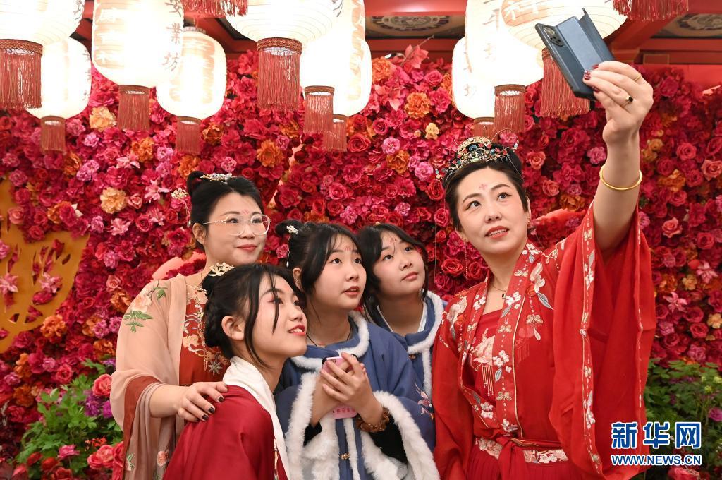 游客身著漢服在西安“長安十二時辰”沉浸式唐風市井生活街區(qū)內留影。新華社記者 劉瀟 攝