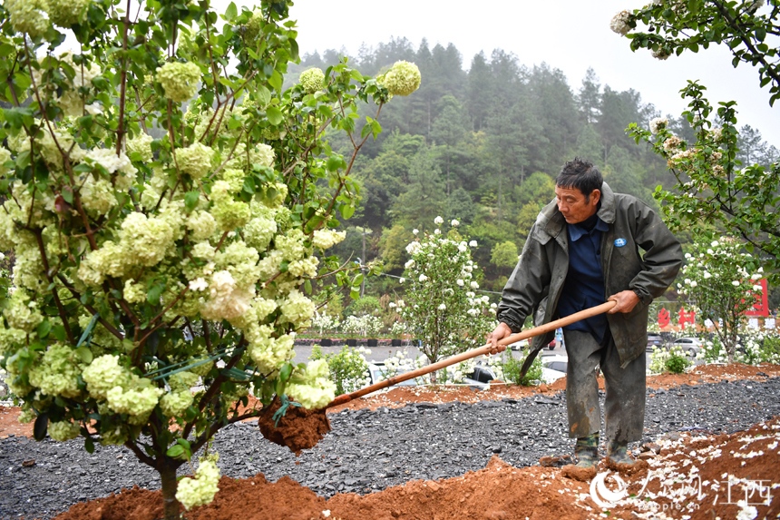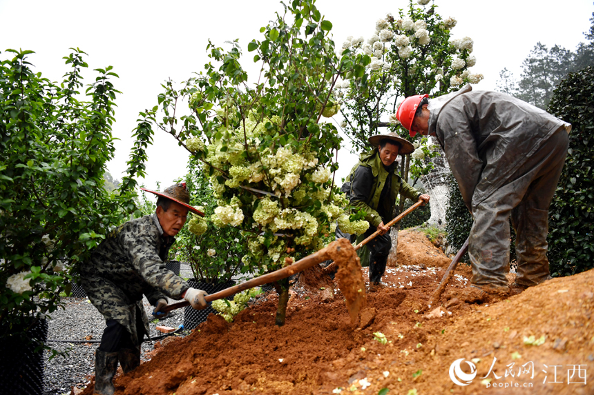 博覽園內(nèi),村民們正在栽種木繡球樹。時雨 攝