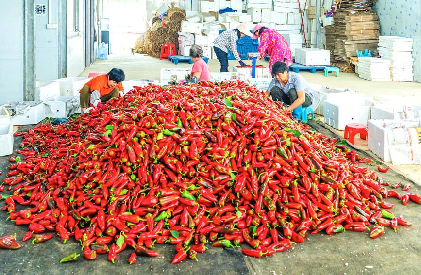 工人收集辣椒拉到附近的工廠進行分揀打包。黃天仕 攝