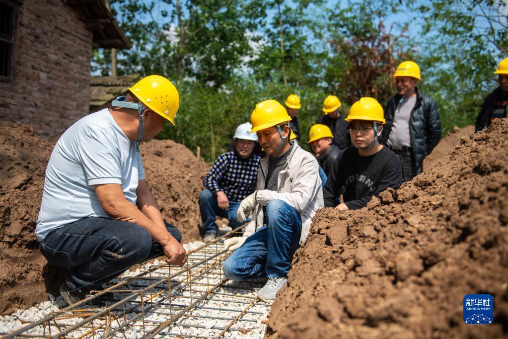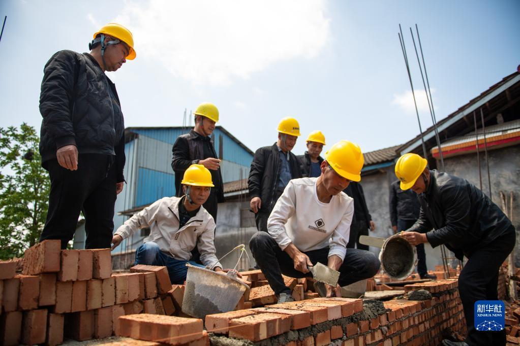 4月25日,在大鯨港鎮(zhèn)五合剅社區(qū),工人在實操砌墻。記者 陳思汗 攝