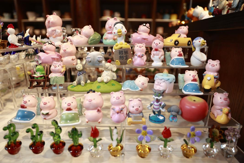 陳家鋪村的“今有光”鄉(xiāng)村創(chuàng)意空間里,擺滿了色彩明快的陶瓷器皿、原生態(tài)木制玩偶及以松陽為元素的創(chuàng)意周邊,引得不少游客前來拍照打卡。